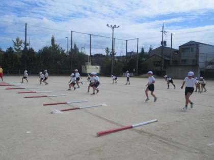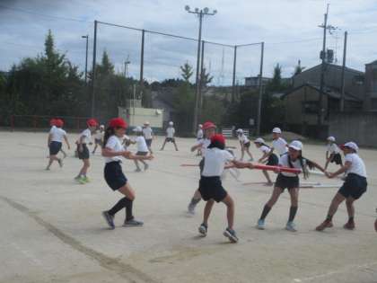 4年生は棒引きの練習をしていました。赤組も白組も,少しでも多くの棒を自分の陣地に引っ張り込めるように作戦をたてていました。