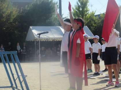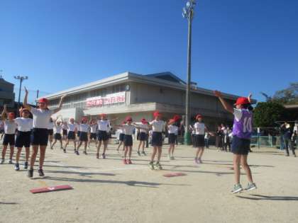 運動会の開会式では,子どもたちが「よし,がんばるぞ!」と気合が入っている様子が見られました。校長先生のあいさつ,はじめの言葉,選手宣誓などの後,全校ダンスを行いました。テンポの良い曲に合わせてしっかりと踊り,準備体操完了です。