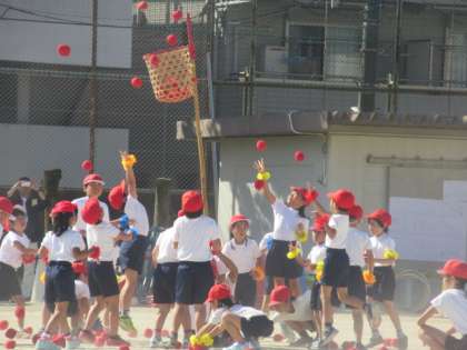 ダンスの後,玉入れがスタートしました。どちらの色もかごをねらって玉を一生懸命投げました。結果,白組の勝利でした。