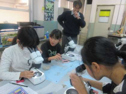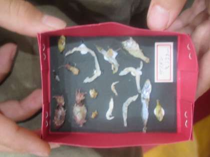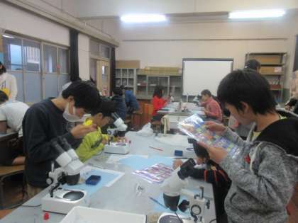 理科の授業は,双眼実体顕微鏡を使って観察を行いました。ピントを合わせる練習をした後,ちりめんじゃこの中にいる小さなカニやエビなどの生き物を観察しました。見つけた生きものは,箱の中に入れてボンドで止め,標本のようにしました。