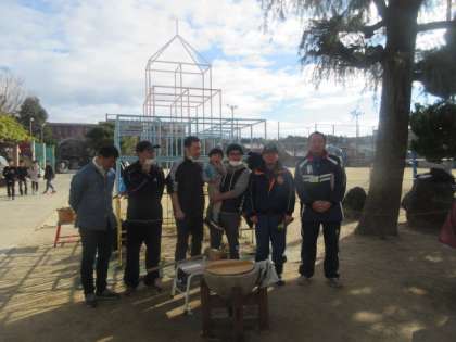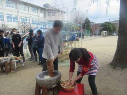 もちつき大会が始まり,多くの子どもたちの姿が見られ,地域の方々も多数,来校されました。今年は,おやじの会をはじめ,同志社大学の方など多くの方がもちつきをしてくださいました。教職員も学校長をはじめ数人つかせてもらいました。色々とこつがあり,難しそうでしたがよい経験をさせていただきました。