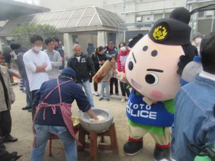 室町校に来てくれたポリスマロンくんまでもちをついてくれました。つきあがったできたてのおもちはおいしく,子どもたちもたくさん食べていました。