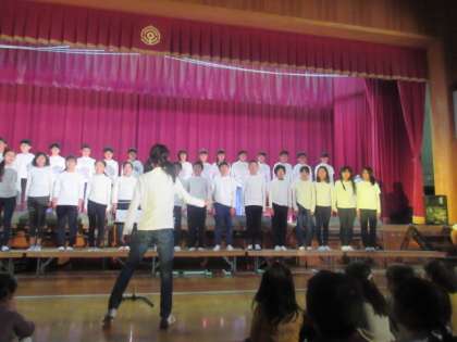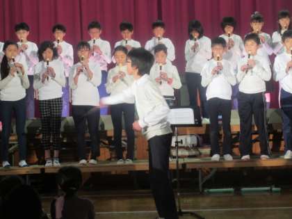 指導に来てくださっている烏丸中学校の先生も見守ってくださる中,美しい歌声,音色を意識して発表しました。指揮も子どもたちが行い,みんなで一つのものを作り上げようとする思いが伝わりました。