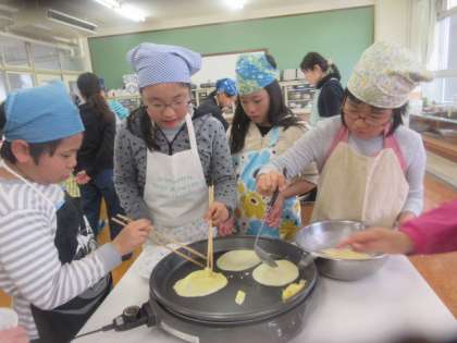 料理クラブは,クレープづくりをしていました。薄く焼いた生地に,生クリームやチョコレート,マシュマロなどを入れて作っていました。とてもおいしそうに出来上がっていました。中には,餃子のように包んだものも・・。みんなで楽しく食べたそうです。