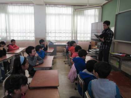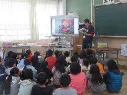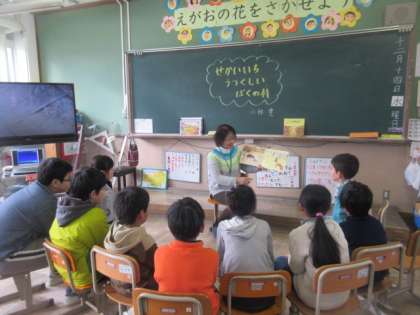 絵本がよく見えるように前に集まって聞いたり,先生が用意したプレゼン画像を見ながら聞いたり,読み聞かせのスタイルは色々でしたが,それぞれの先生の思いが込められた読み聞かせでした。子どもたちはみんな真剣に聞いていました。