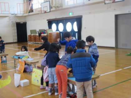1年生は,生活の時間に秋見つけを行い,その時見つけたどんぐりや松ぼっくり,落ち葉などを使って,色々なものを作って遊びました。そして,楽しい秋まつりを開こうとこれまで準備を行ってきました。今日は本番。京極幼稚園の方や担任以外の先生を招待して秋まつりスタートです。
