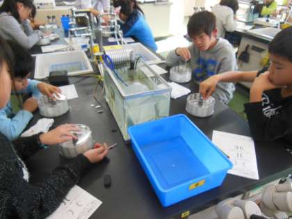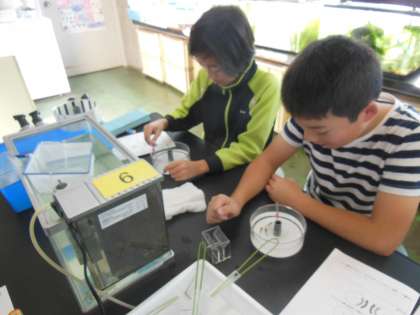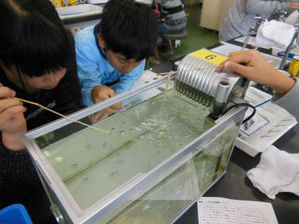 他にもどんな特性があるのか,川の流れに対してめだかはどう泳ぐのか,流れをつくって実験しました。その結果,流れとは逆に泳ぐことがわかりました。そうでないと海にまで流されてしまうからだそうです。実験や観察をしながらめだかについて楽しく学べたよい時間となりました。