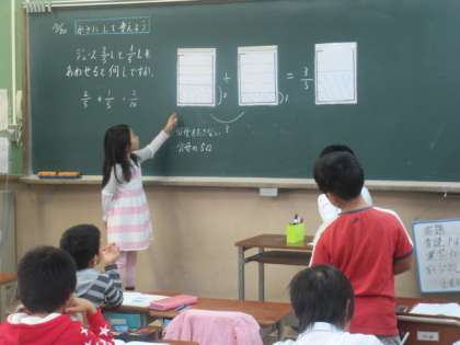それぞれの考えを話し合いました。「分母も分子もたす」という考えと,「分母はそのままで分子はたす」という考えが出て,それぞれ意見を出しました。