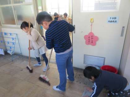 1年生もすっかり掃除に慣れ,ほうきを上手に使って掃き掃除をしたり,まどをきれいにふいたりしていました。手洗い場もスポンジでピカピカに磨いています。よくがんばりました。