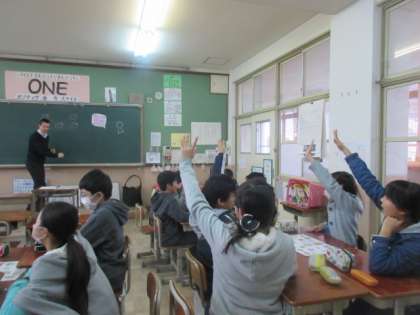 今日は高学年の英語活動の日でした。今日の学習は,今大人気のピコ太郎さんのように,二つの物の言葉をくっつけて言葉をつくるというものでした。