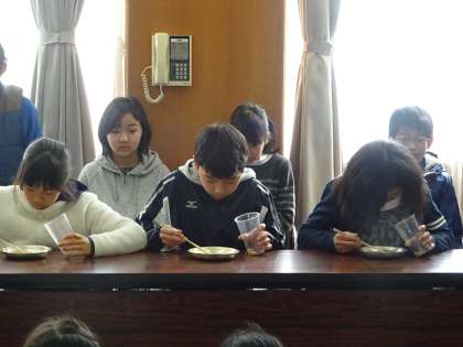 給食週間の給食委員会の取組の一つとして,毎年恒例の豆つまみ大会があります。各クラスから代表2名が選ばれ,学級対抗でどれくらい多くの豆をつまめるかを競います。クラスで予選を行いその中で勝ち上がってきた2名の子どもたちです。