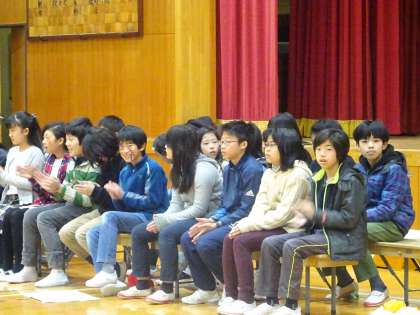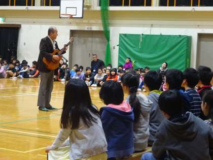 そしてなんと,今回は校長先生からの歌のプレゼントもありました。6年生が組体操を行ったときに使っていた曲「友」と,校長先生の好きな曲「糸」を,校長先生のギターに合わせて6年生と共に歌いました。色々な思い出がよみがえったことでしょう。
