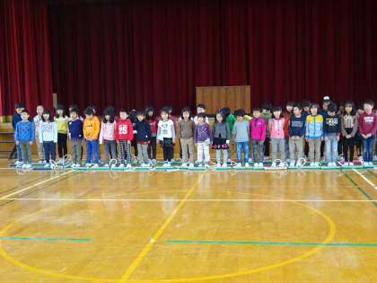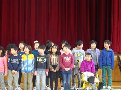 1年生は体育館で,来年度の1年生をお迎えするための言葉や歌の練習をしていました。言葉をゆっくりはっきり話すことを意識して練習しました。全員で声をそろえて言葉を言うところのタイミングが難しかったようで,先生の合図を見ながら何度も練習していました。