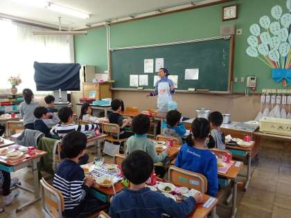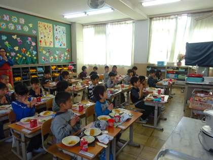 子どもたちは「おいしい。おいしい。」と喜んで食べていました。野菜もしっかりと食べられた子どもが多かったです。次の給食も楽しみにしているようです。