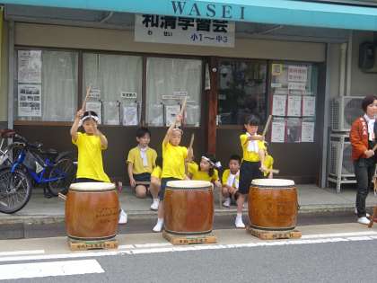 学校の正門前では,おみこしをむかえるために和太鼓の演奏が行われていました。軽やかなリズムがお祭りの雰囲気を高めていました。