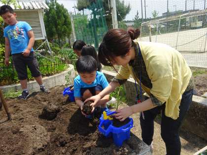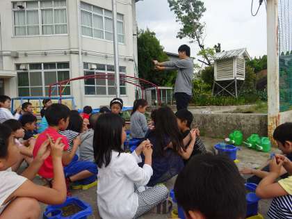今日はよい天気なので,2年生はトマトの苗を自分の植木鉢に植えかえる活動をしていました。3年生は育てたい野菜や花を選んで種をまいていました。