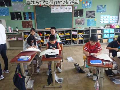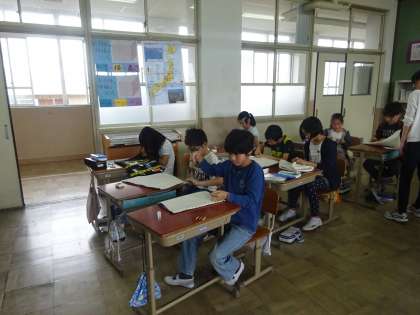 5年生のナップサックづくりは,わきのところを縫う作業をしています。じょうぶにきれいに縫えるように一針一針ていねいにぬっています。みんなとても真剣です。なみ縫いにもずいぶん慣れ,すばやくできるようになってきました。