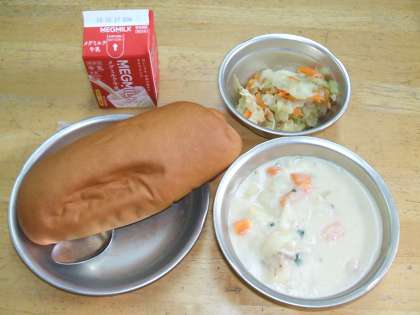 ほたてのクリームシチューはじゃがいもやにんじんもやわらかくなっておいしかったですが,ほたての苦手な子どもがいないか心配です。ソティは少し水分が多い感じがしました。