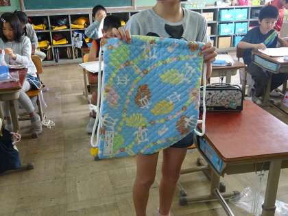 2時間集中して一針一針ていねいに縫いました。中に荷物を入れるので,ほつけてこないように補強し,ひもを通して完成です。