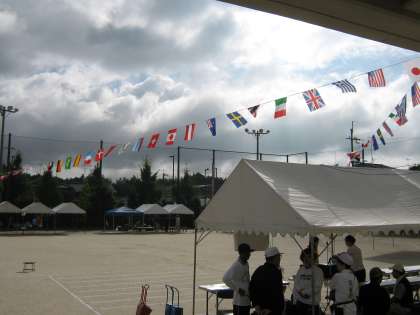 朝から雨が上がり,午前7時から体育振興会の皆さんが,急ピッチで準備を行いました。本日10時30分開式の予定です。開始が遅れた分,開会式の入場行進を省くなど,できるだけスムーズに大会を進め,遅くならないように進行を行っていきます。