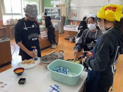 先週の学級活動「食の学習〜適塩を知ろう〜」の学習を思い出し、「ほら、ちゃんとお醤油の量を量らないと。塩分取りすぎちゃうよ。」と声をかけ合っていました。学習が積み上がっていっています。