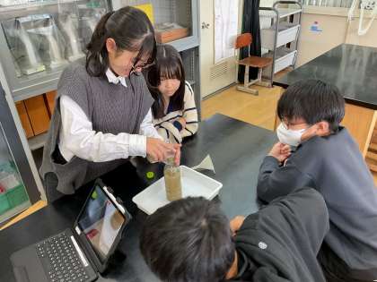 これまでの学習から、地層がどのようにつくられているのか学習問題を立て、予想や計画をしました。粒が大きい「れき」と粒が小さい「どろ」、どちらが先に沈むのか、実験をしてみると予想通りだった人も、意外な発見をした人もいるようです。