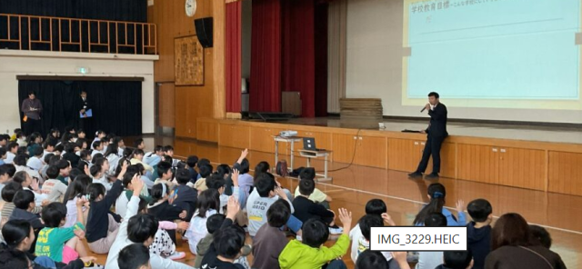 全校で体育館に集まり、校長先生から、室町小学校のみんなで楽しい学校にしていくためのお話を聞きました。