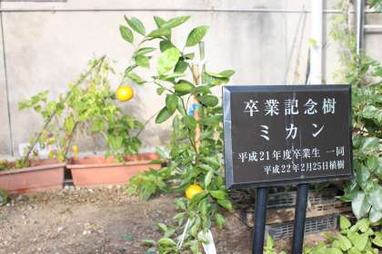 昨年度の卒業生が記念に植樹した「みかんの木」に実がつきました。個数は二つでしたが、見事に色づきました。来年の成長が楽しみです。