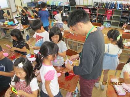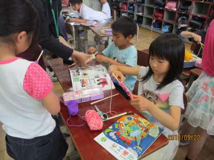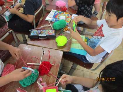 図画工作科の授業で,毛糸とわりばしを使って飾りをつくりました。色の組み合わせを工夫して,大変,色とりどりの作品が出来ました。