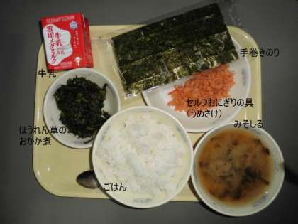 今日の給食は,ごはんと梅さけを手巻きのりで巻いて食べます。