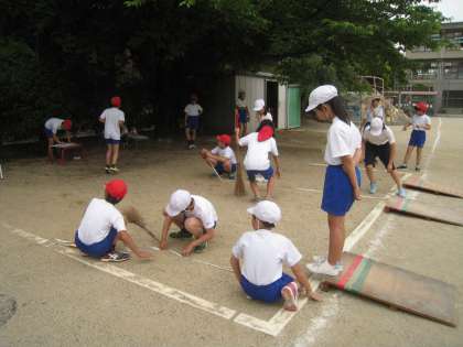 先週までは,走りはばとびをしていました。歩幅や跳び方に気を付けながら目標に向かって挑戦しました。グループで記録等の役割分担も考えました。友だちと励ましあったりアドバイスをしたりしながら頑張っていました。