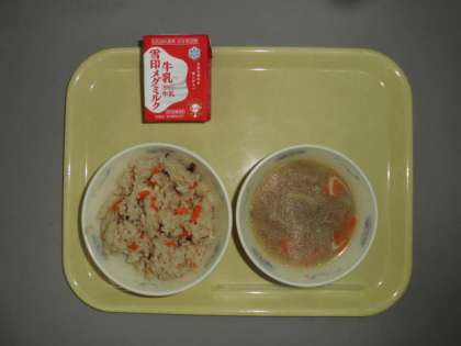 アルファー化米を給食室前に展示しておくと,給食当番の児童がそれを見て,「インスタントごはんやな。」と・・・。