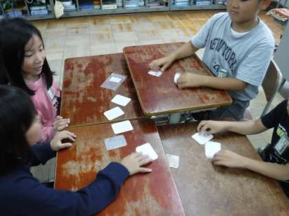 そのつぎは,グループで一人ずつ裏向けたカードをめくって,動物の名前を言っていきます。分からない言葉があっても,グループのみんなで助け合って活動することができました。