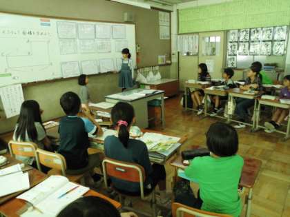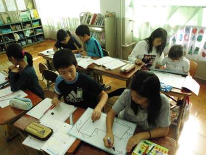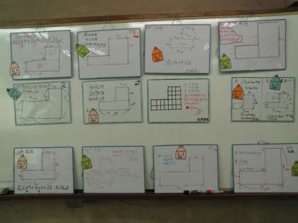「面積」の学習をすすめています。今日は,複合図形の面積の求め方を工夫して考えました。ふたりまなびにおいては,ミニホワイトボードを用意しました。課題解決に向けて,話し合ったり,整理がしやすい様子でした。その後のみんなまなびでは,いろいろな考え方をしっかり説明することができていました。