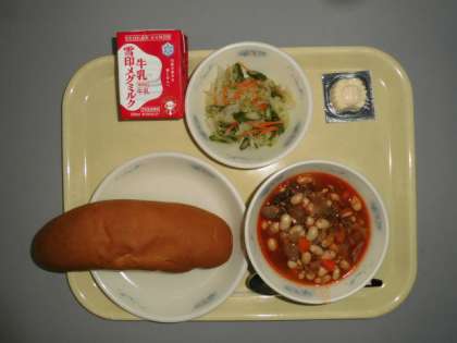 「大豆と牛肉のトマト煮」の大豆は,肉や魚に負けないぐらい質の良いたんぱく質を含んでいるので「畑の肉」と言われています。じっくりと煮込んであるので,大豆や牛肉にトマトの味がよくからんでおいしかったです。