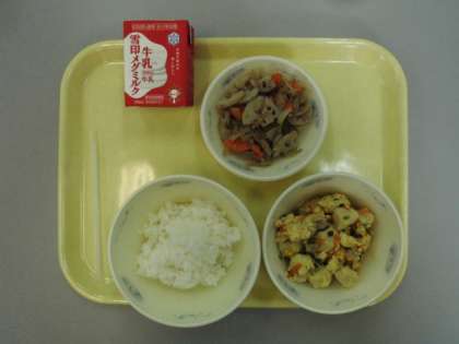 今日の「高野どうふのたまごとじ」には高野どうふを使っています。高野どうふは,和歌山県の高野山の小僧さんがで,冬の寒い夜にとうふを外に置き忘れ,凍ってしまったものを次の日に食べたことからできたそうです。子どもたちには,食べ物にまつわるエピソードなども知って,楽しく食べてほしいと思います。