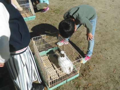 中間休みの時間に,自然環境委員会の企画でウサギとふれあいタイムがありました。