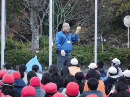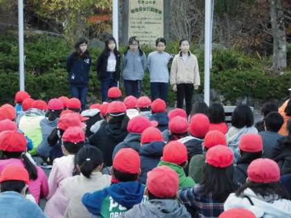 練習をしてきたリーダーたちは,大勢の前でノーマイクでしっかりと京極小学校の紹介をしてくれました。