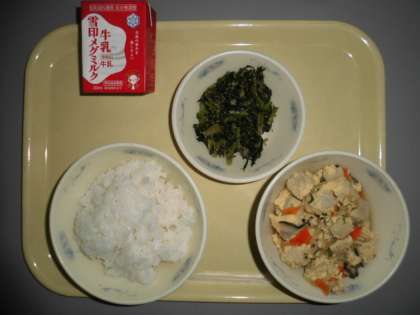 「高野豆腐の卵とじ」は,高野豆腐に花かつおで取っただしがしみ込んで,とてもおいしかったです。卵,にんじん,しいたけ,ねぎ等も入っていて彩りもきれいでした。
