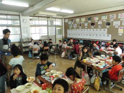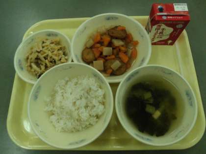 「たけのこごはんの具」は春においしいたけのこがたっぷり使われていました。シャキシャキとしたたけのこの食感楽しむことができました。みんなごはんにまぜて,たけのこごはんにして食べました。だしがよくきいていて「おいしい!」と言っていました。