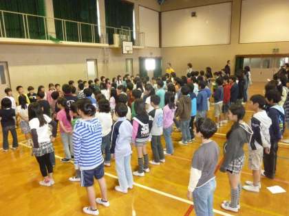1年生を迎える会もいよいよ大詰め,全員で「君をのせて」を歌った後,「もっと,もっと,仲よくなりましょう。」の終わりの言葉,そして大きな手拍子の中を1年生が退場して,1年生を迎える会を終えました。