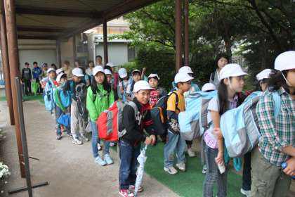 出発式の様子です。あいにくの雨模様ですが、みんな元気に出発しました。