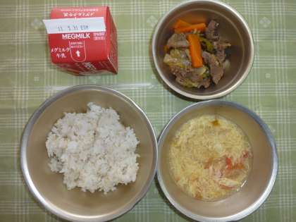 今日の給食の献立は,「麦ごはん」,「牛乳」,「焼肉」,「トマトと卵のスープ」でした。「トマトと卵のスープ」はあっさりとしていて,「焼肉」,「トマトと卵のスープ」ともに,とてもおいしくいただくことができました。