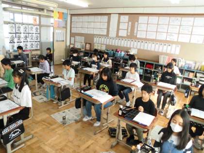 字配りと文字の中心に気をつけて「温故知新」の練習をしました。字形を整えて書くには,お手本とにらめっこし,ゆっくりと運筆することが大切です。それに加え,やはり集中して書くことが大切です。1分間の黙想(精神統一)後,作品錬成に入りました。終始,静まり返った中での授業でした。