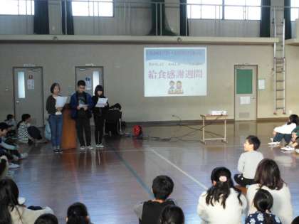 その後,健康委員さんから「給食感謝週間」について話がありました。給食調理員さんや食材を作ってくださっている方々に感謝の気持ちをもつようにしたいと思います。また,豆つまみ大会も行われます。みんながんばって練習をしています。