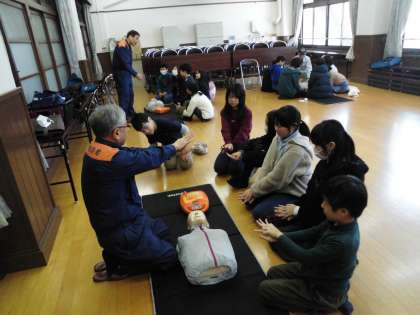突然のけがや病気で倒れた人に対して行う応急手当,特にAED(自動体外式除細動器)の使用方法,心肺蘇生法や人工呼吸などを学ぶ救命講習を実施しました。