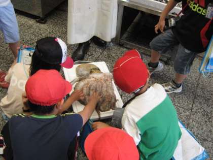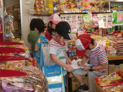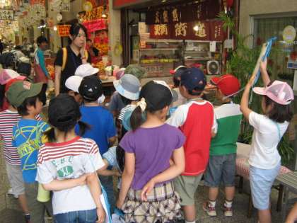 出町桝形商店街に到着すると担任の先生から注意を聞いて,すぐに探検に出かけました。4つのグループに分かれて探検に出発。たくさんあるいろいろなお店を,一軒ずつしっかりと調べていきました。