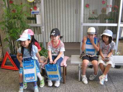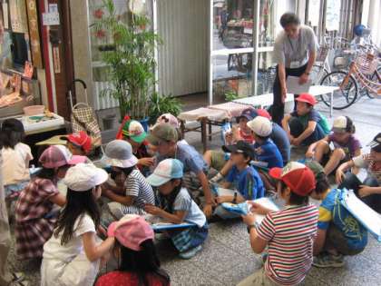約1時間の「出町桝形商店街」の町たんけんでしたが,疲れてしまって休憩する一こまもありました。4つのグループに分かれて行った町たんけんで,分かったことや知ってほしいことなどをまとめて,発表会をする予定です。