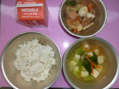 今日の給食の献立は,「麦ごはん」,「牛乳」,「プリプリ中華いため」,「とうふと青菜のスープ」でした。「プリプリ中華いため」の時にはいつもスープがついていますが,今日は「とうふと青菜のスープ」でした。「とうふと青菜のスープ」には,チンゲン菜が使ってあり,「プリプリ中華いため」と一緒においしくいただきました。