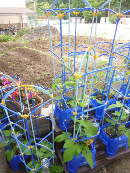 1年生が青い植木鉢で育てている「アサガオ」が,6月下旬となり画像でご覧のようにグングンと成長しています。大きな葉も茂り,立てた支柱よりも長く伸びた蔓もあります。水やりなどの世話をしっかりとして,大きな花を咲かせてほしいと思います。